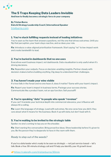 Group coaching for Data Teams: Great data teams can make or break businesses. Through my facilitated 6-week group coaching program, together we get to the heart of what is holding teams back and set a course for data-driven success.